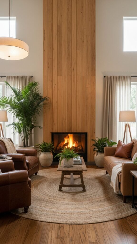 Wood paneling is intrinsically linked to retro interiors. Wrapping the entire fireplace chimney breast in vertical, warm-toned wood slats adds incredible architectural height and natural warmth to your living space.