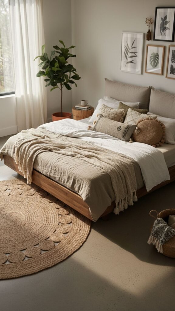 - Place a jute or vintage-style rug under the bed to anchor the space