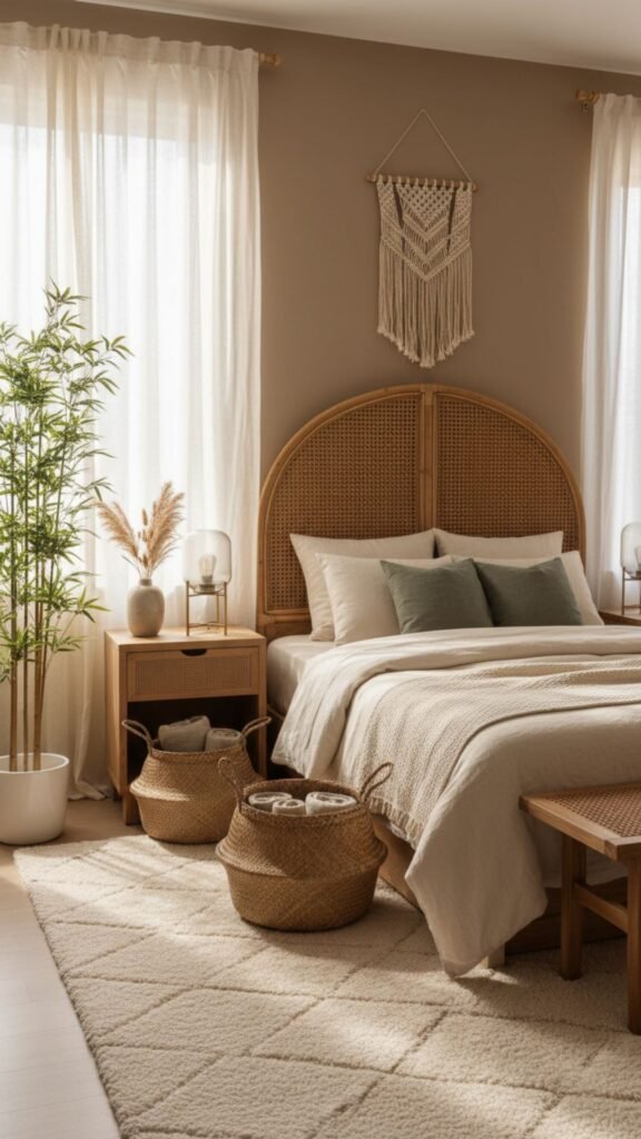 Incorporating natural materials is essential to modern boho style. Rattan headboards, wooden nightstands, and woven baskets bring warmth and organic appeal without overwhelming the space.