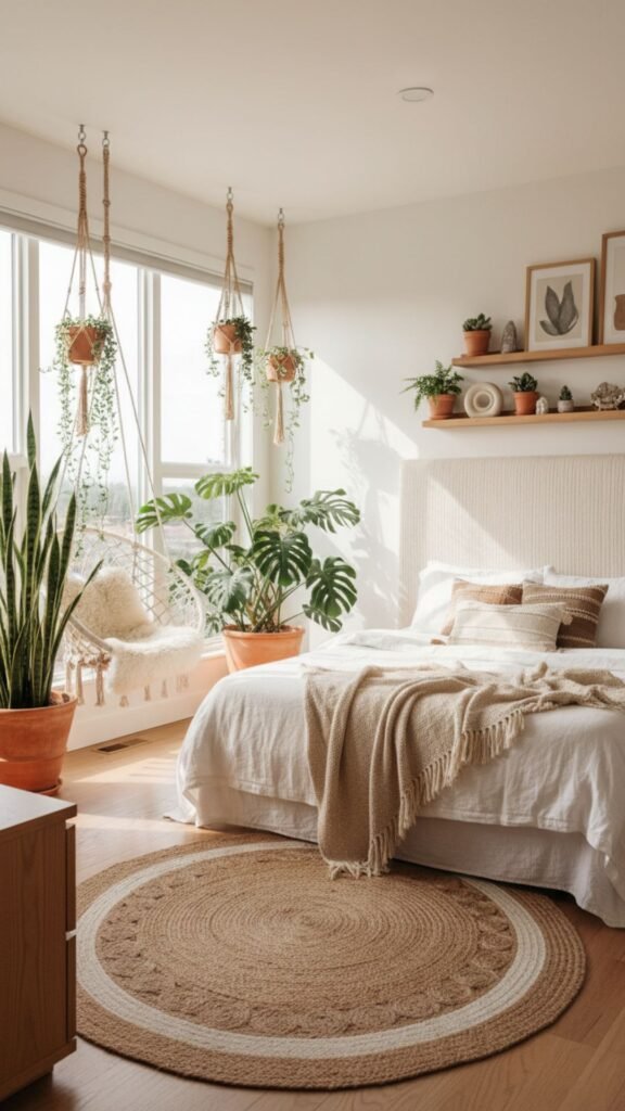 Greenery breathes life into any bedroom. Plants not only purify the air but also add pops of color that complement the earthy tones typical of boho design.