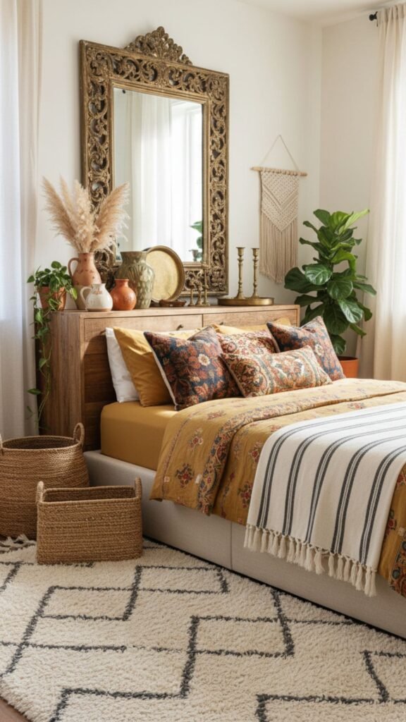 Modern boho embraces individuality. Vintage finds and handcrafted pieces add character and tell a story, making your bedroom feel personal and curated.
