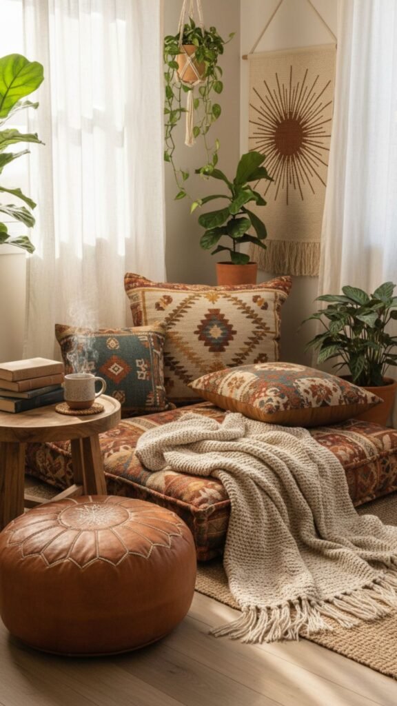 Transform a corner of your bedroom into a cozy reading nook. Floor cushions, poufs, and a small side table create an inviting space to unwind.