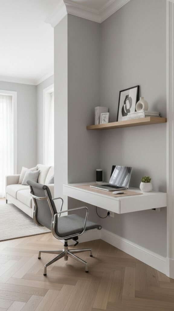 Working from home does not require an entire room. A small, modern desk tucked into a corner provides a highly functional workspace that blends seamlessly with your living room decor. This setup keeps your productivity high without disrupting the flow of the room.