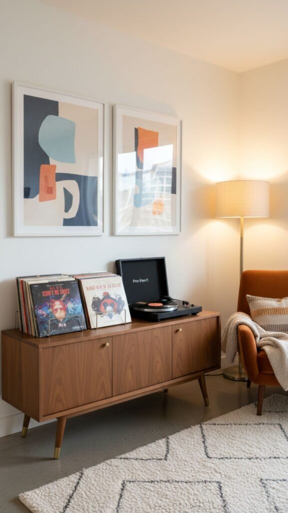 - Place a mid-century modern media console in the corner.