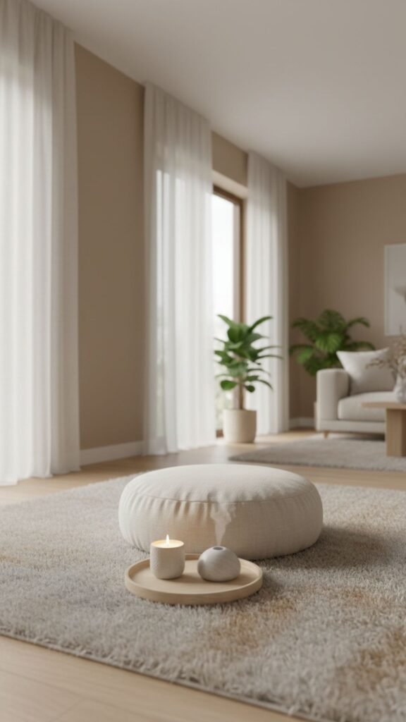 A meditation nook provides a physical space to disconnect and recharge. This concept relies heavily on soft textures, low profiles, and an absolute lack of clutter. It brings an immediate sense of calm to your modern living room.