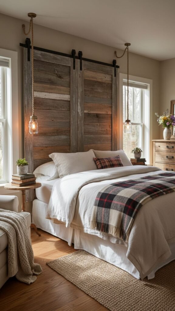 For those who love farmhouse charm, a barn door headboard offers rustic appeal with a cozy, lived-in feel. The weathered wood and simple lines create a warm, inviting atmosphere.