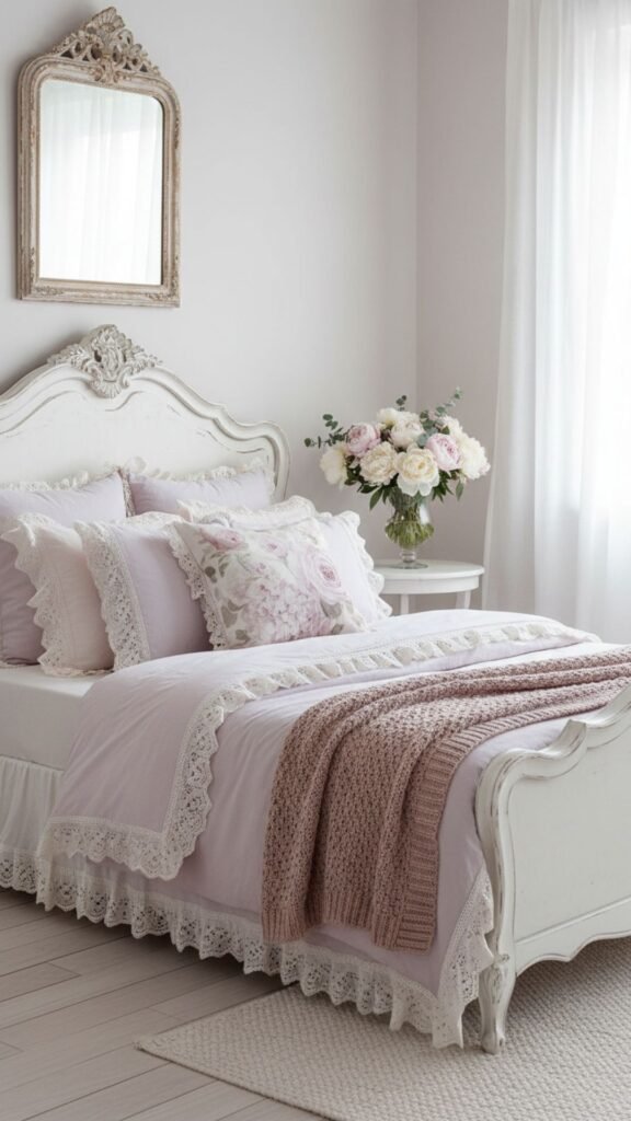 Shabby chic style combines vintage elegance with a soft, feminine touch. A distressed white headboard creates a dreamy, romantic vibe perfect for a serene bedroom retreat.