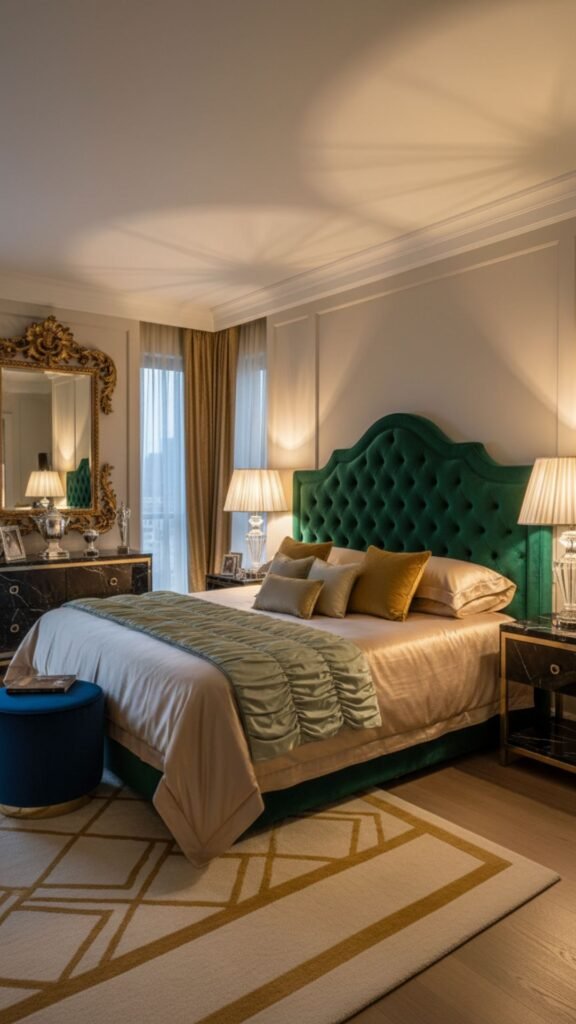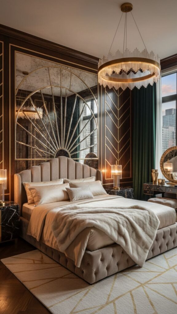 Art Deco style celebrates glamour and geometric elegance. A mirrored headboard reflects light beautifully and adds a touch of Hollywood Regency sophistication.