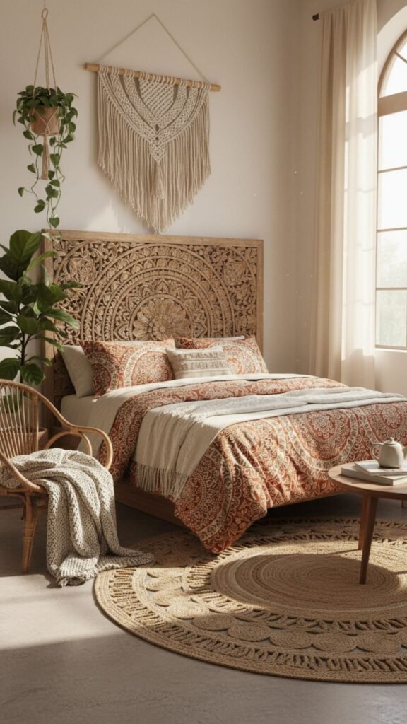 - Look for headboards with mandalas, geometric carvings, or floral motifs