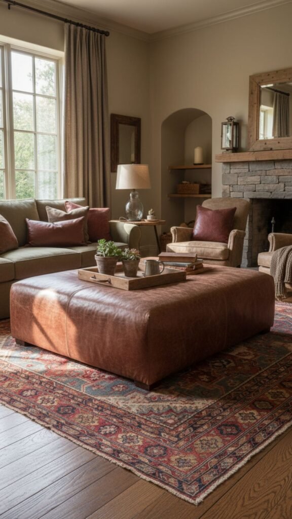 Swap the hard edges of a traditional wooden table for a plush, oversized ottoman. This adds instant warmth to the room and serves as a highly comfortable footrest or extra seating when guests arrive. It bridges the gap between cozy cabin style and practical everyday living.