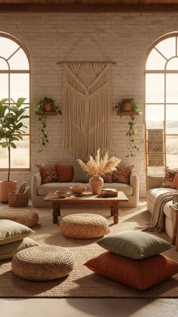 Scatter textured poufs and thick floor cushions across the center of your space. This approach creates a relaxed, bohemian-rustic atmosphere that invites family and friends to sit back and lounge comfortably on the floor.