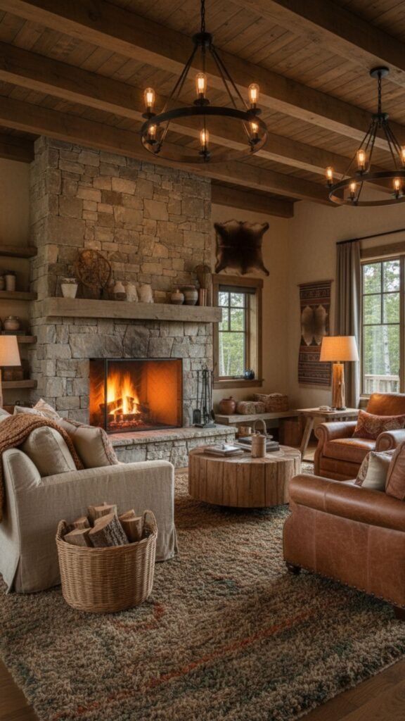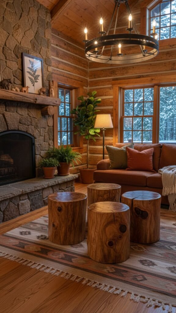 Shift the room’s entire focal point toward a stone fireplace or wood-burning stove. Removing the coffee table draws the eye directly to the hearth, amplifying the cozy, cabin-like feel of your home.