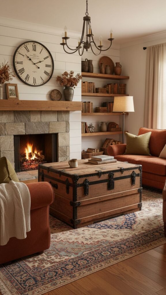 Repurpose an old steamer trunk or a weathered wooden chest as your central anchor. It brings a deep sense of history to your living room while hiding away bulky blankets, pillows, and board games out of sight.