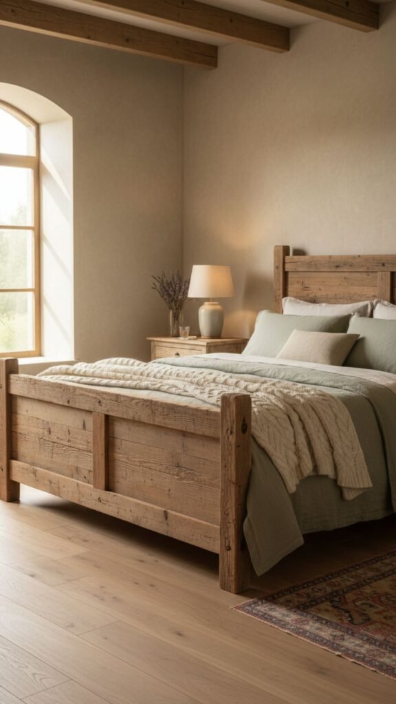 Raw, weathered wood instantly anchors a room with a sense of age and authenticity. A reclaimed wood bed frame brings warmth and texture that no modern alternative can replicate—each knot and grain tells a story.