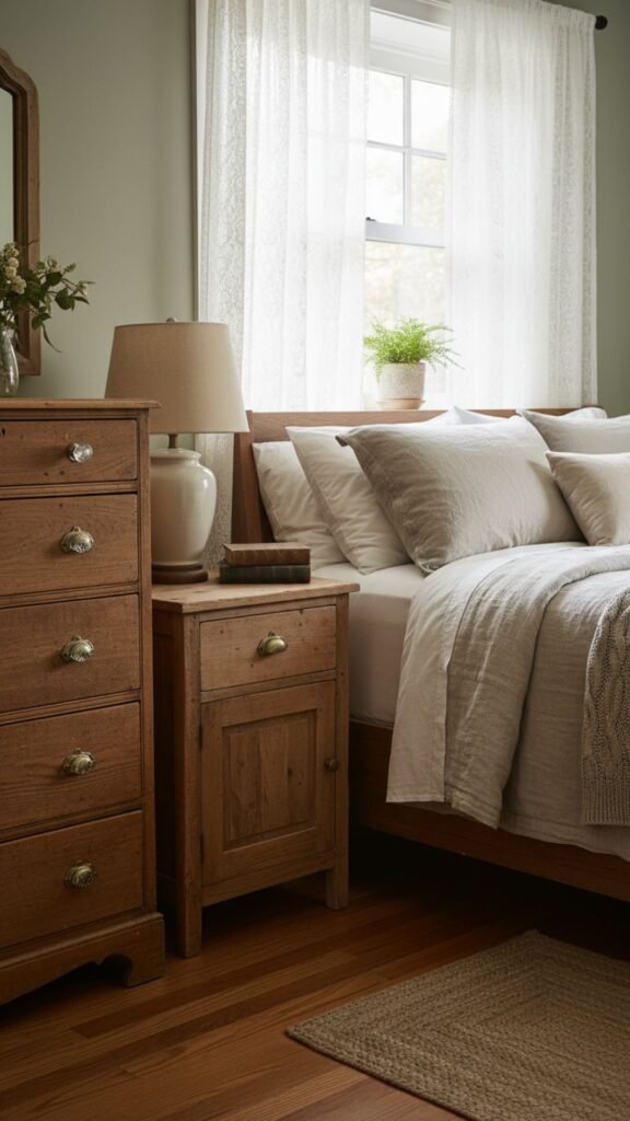 Mismatched antique furniture adds personality that no matching bedroom set ever could. Hunting for pieces at flea markets or estate sales is half the fun.