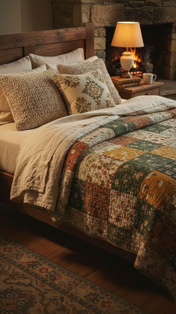 Rustic vintage bedrooms feel lived-in and luxurious at the same time. The key is layering—quilts, pillows, and throws that look effortlessly piled on rather than hotel-pressed.