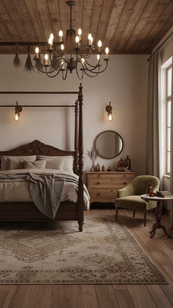 Lighting shapes mood more than almost anything else in a bedroom. Wrought iron chandeliers or warm brass sconces immediately shift a space toward the vintage end of the spectrum.
