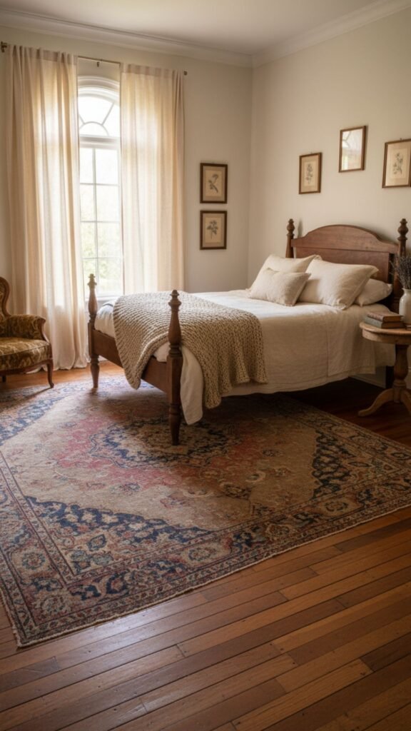 The floor grounds the entire aesthetic. Worn hardwood or a well-loved vintage rug sets the tone before you’ve even looked at the walls.