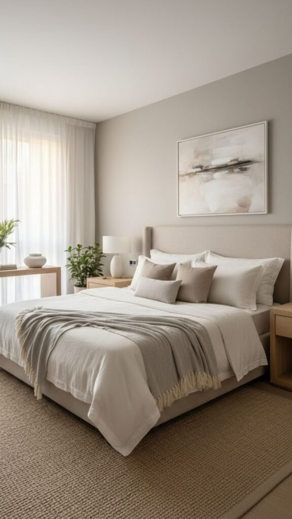 Soft, muted tones work best. Think warm whites, greiges, sage greens, dusty blues, and earthy taupes. These colors are calming to the eye and help signal to your brain that it’s time to wind down.