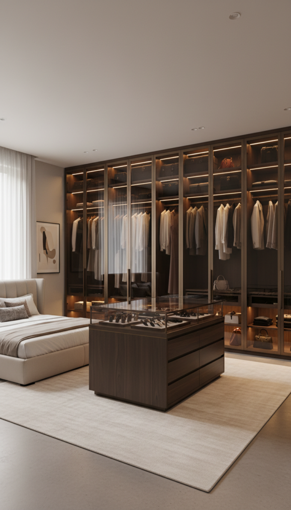 Turn your wardrobe into a display case. This high-end look encourages you to keep your clothes tidy and mimics the feel of a luxury fashion store.