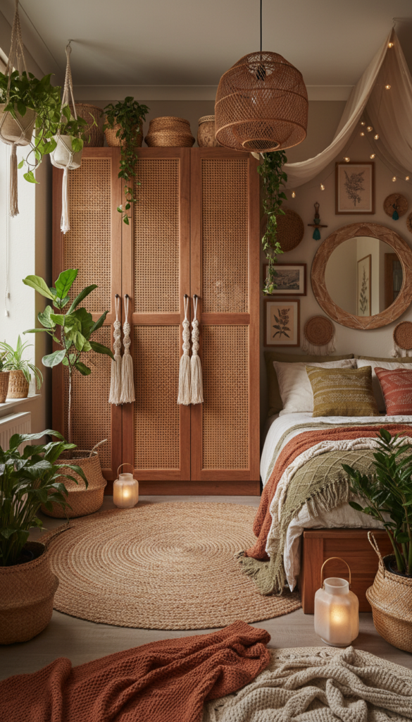 Boho decor is all about natural textures and relaxed vibes. A built-in wardrobe in this style often uses mixed materials to soften the look of the room.