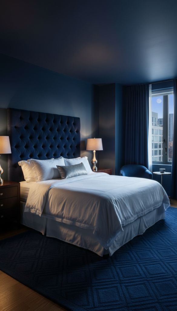 For those who prefer a moodier aesthetic, midnight blue creates a deep, calming cocoon. It is a dramatic alternative to black that adds depth and elegance. This shade helps to visually shrink the room in a cozy way, promoting deep sleep and relaxation.