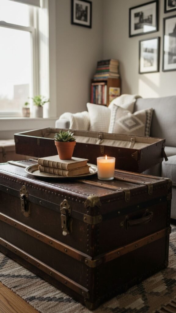 An antique steamer trunk serves a dual purpose in a small apartment. It acts as a stunning, conversation-starting coffee table while providing hidden storage for blankets and board games. The leather and brass detailing adds a rugged, traveled aesthetic.