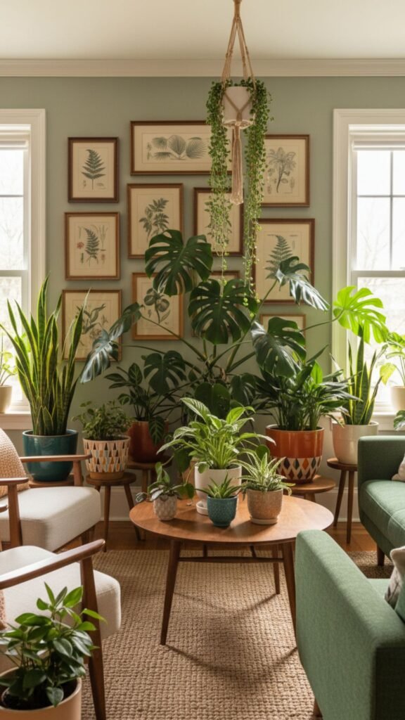 The 1970s interior design movement heavily featured indoor plants and nature motifs. Bringing greenery indoors adds life to sterile apartment environments. Pairing live plants with vintage botanical illustrations creates a lush, historic conservatory feel.