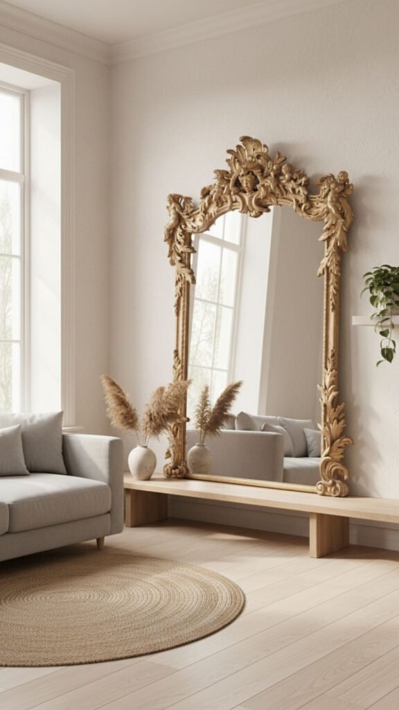 Mirrors are a classic apartment hack for making rooms feel larger and brighter. A large mirror with a vintage frame does this while adding a touch of old-world glamour. It reflects both natural light and your carefully chosen decor.