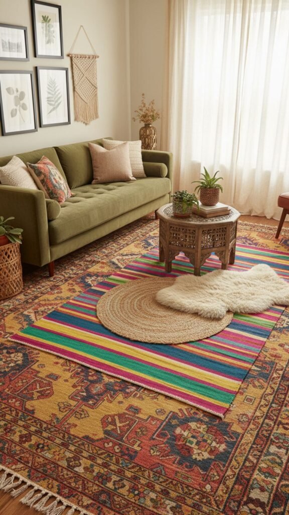 - Layer a smaller, patterned rug on top at an angle