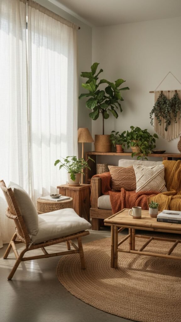 Boho interiors are deeply rooted in nature. Rattan, bamboo, wood, linen, and cotton are your best friends here. These materials add an organic, grounded quality that synthetic alternatives simply can’t replicate.