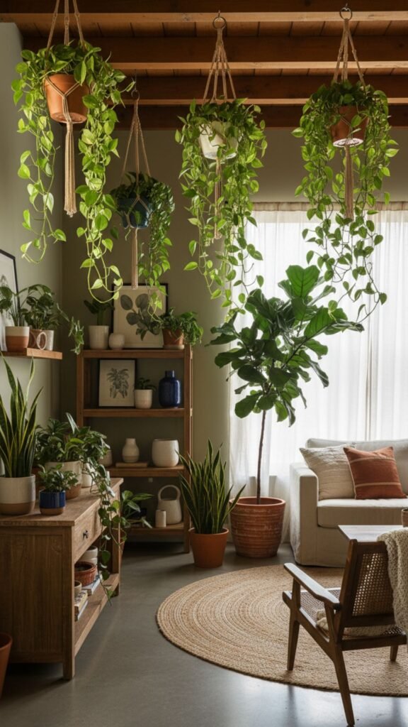 - Hang trailing plants from macramé hangers near windows