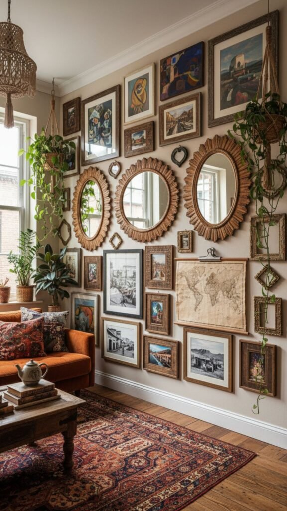 A gallery wall in a boho space is less about rigid symmetry and more about storytelling. Mix framed artwork, mirrors, vintage finds, and even hanging plants to create a collection that feels personal and well-traveled.