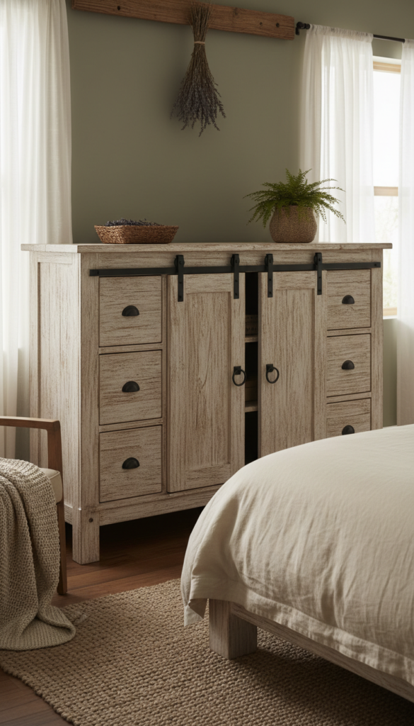 If you want your room to feel cozy and lived-in, the farmhouse aesthetic is ideal. These dressers often feature distressed wood, whitewashed finishes, and sturdy construction. It’s a look that says “comfort” immediately.