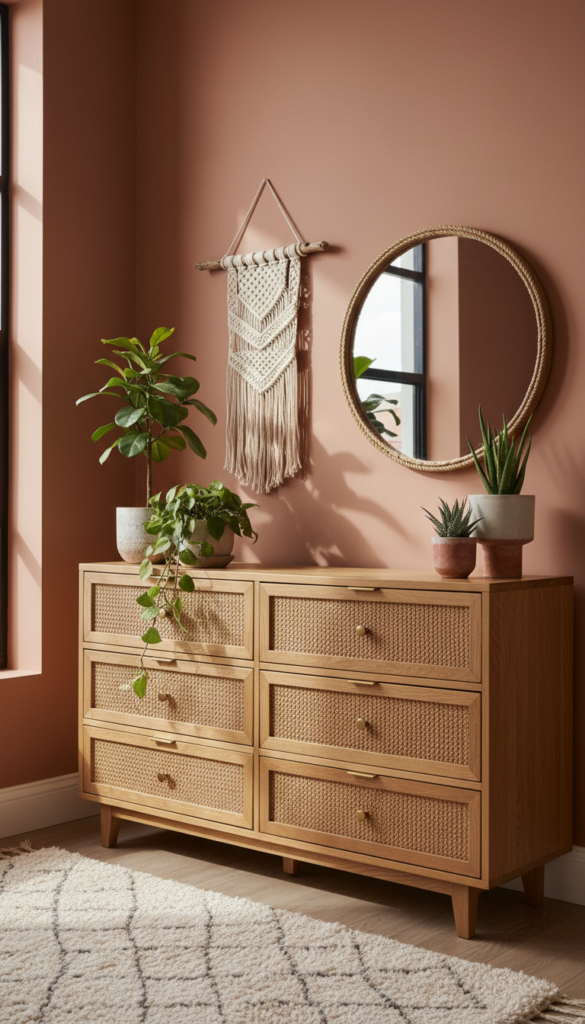 Bohemian style is all about texture and natural elements. Rattan, cane, or wicker detailing on dresser drawers adds warmth and an earthy feel that is incredibly trendy right now.