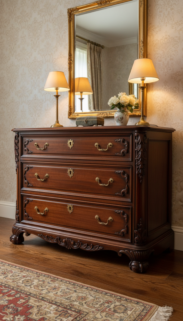 Traditional dressers are substantial, ornate, and built to last. They often feature darker woods like mahogany or cherry and include detailed molding or brass hardware.