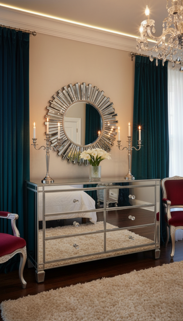 For those who want a touch of luxury, a mirrored dresser is a showstopper. It reflects light, making the room feel brighter and larger, and adds a Hollywood Regency vibe.