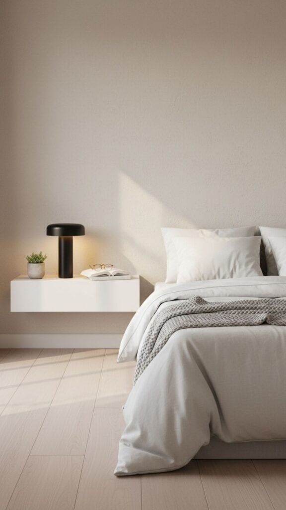 A floating shelf nightstand creates a clean, uncluttered look that’s perfect for small bedrooms. This space-saving option attaches directly to the wall, giving your room an airy, modern feel.