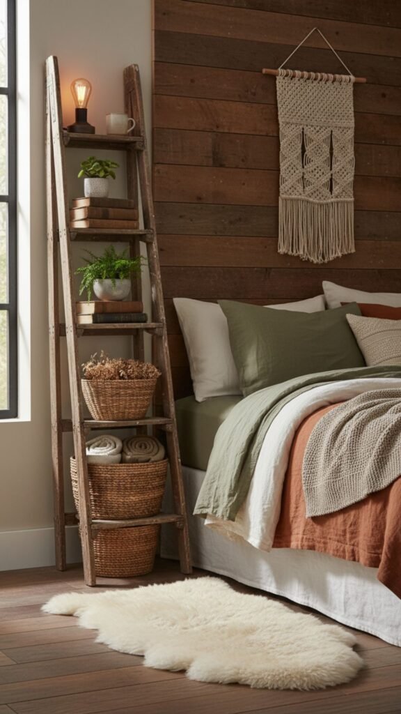 Repurposing a vintage wooden ladder brings character and rustic charm to your bedroom. Each rung becomes a shelf for books, plants, or decorative items.