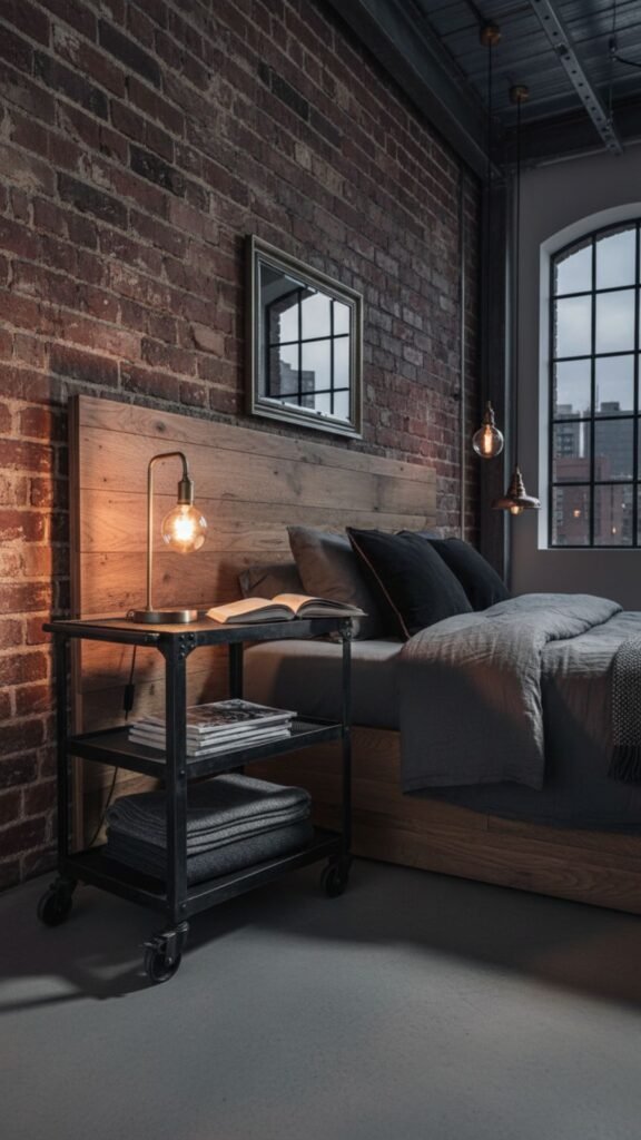 A rolling metal cart offers flexibility and industrial appeal. You can easily move it around and the open shelving provides plenty of storage for bedside essentials.