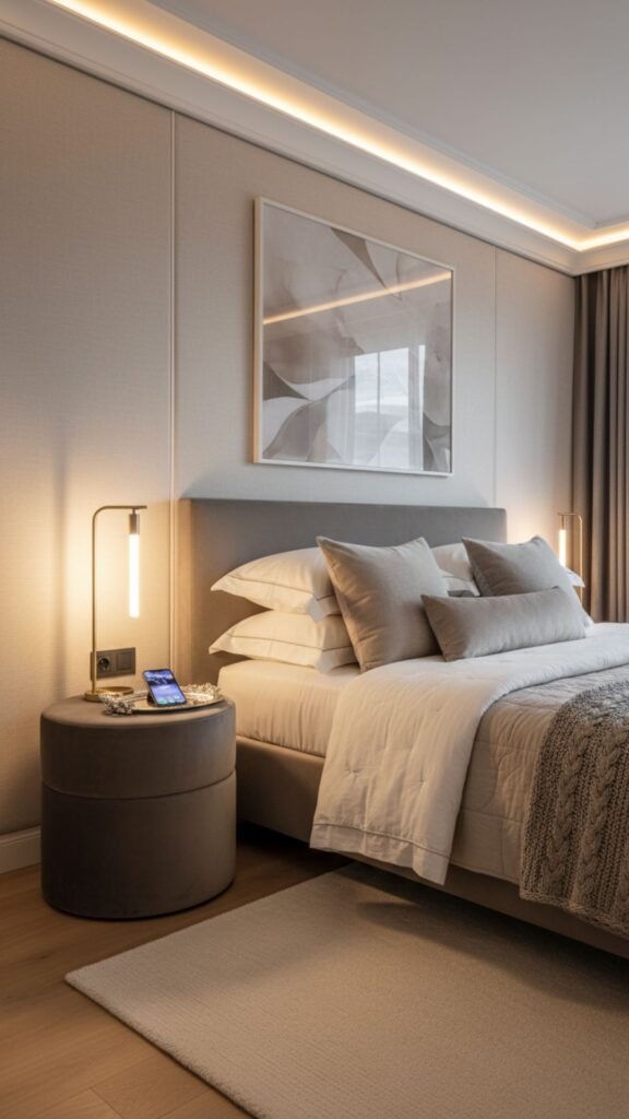 An upholstered ottoman offers hidden storage and soft texture. Place a decorative tray on top to create a stable surface for bedside items.