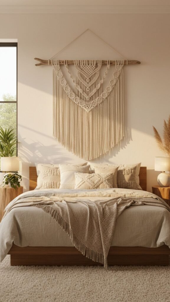 Nothing screams “boho” quite like macrame. The intricate knots and soft cotton texture add immediate warmth to a room without overwhelming it with color. It acts as a focal point, drawing the eye and breaking up the flatness of a painted wall.