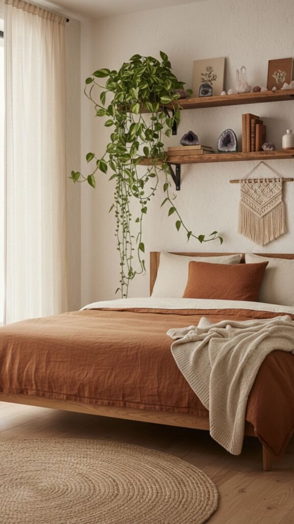 Plants are the lifeblood of bohemian decor. Installing floating shelves allows you to bring nature indoors. The contrast between rustic wood shelves and vibrant green leaves adds energy and freshness to a tired bedroom.