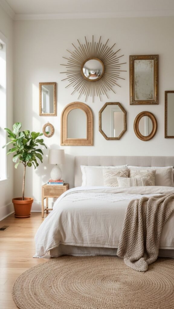 Mirrors bounce light around, making small bedrooms feel larger and airier. A collection of mismatched vintage-style mirrors adds that “flea market find” charm that is central to the boho aesthetic.
