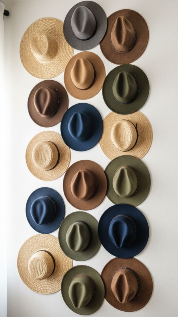 - Invisible Hooks: Use small command hooks or nails so the hardware is invisible, making the hats appear to float.