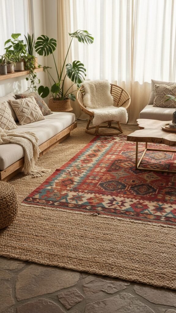 Rugs are essential for adding warmth and texture to a bohemian space. Layering them creates an immediate sense of coziness and visual interest. You can mix and match different patterns, sizes, and materials for a highly personalized floorscape.