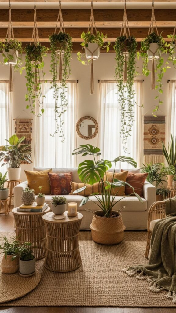 Plants breathe life into any room and are a staple of bohemian decor. They add vibrant color and a vital connection to the outdoors. Mixing different types of greenery creates a lush, jungle-like environment.