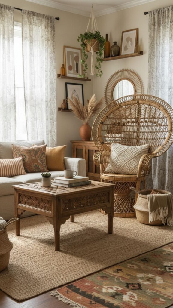 A matched furniture set feels too rigid for a bohemian space. The boho aesthetic thrives on combining pieces from different eras and styles. Rattan, wicker, and distressed wood furniture add immense character and a sense of history.