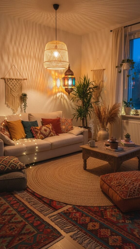Harsh overhead lighting ruins a relaxing mood. Bohemian rooms rely on soft, warm, and scattered light sources. Lanterns, fairy lights, and shaded lamps create a magical, cozy glow when the sun goes down.