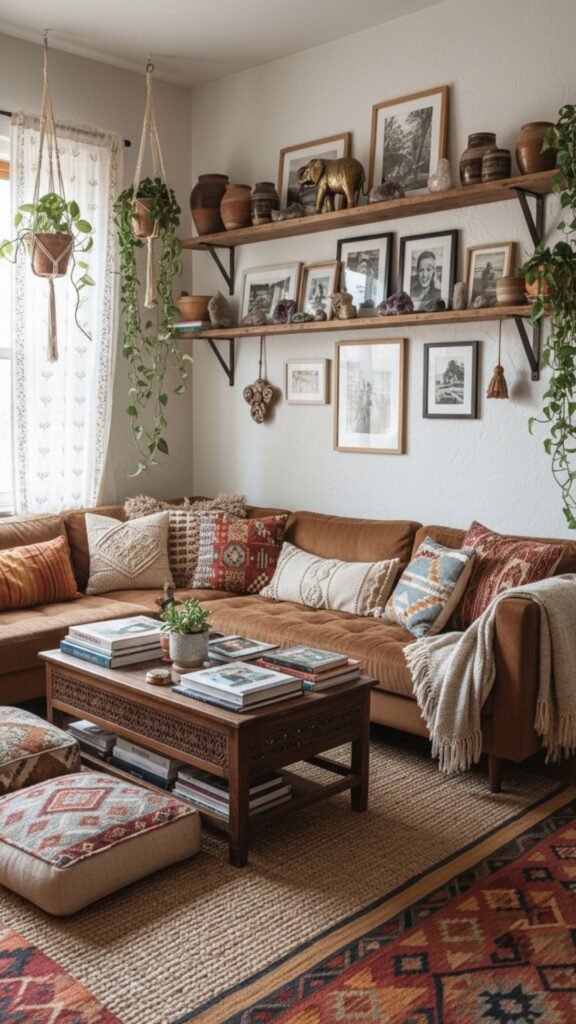 Boho style is deeply personal and tells the story of the people who live there. Displaying your favorite books, travel souvenirs, and unique trinkets gives the room soul. It proves that your space is curated over time, not bought all at once.